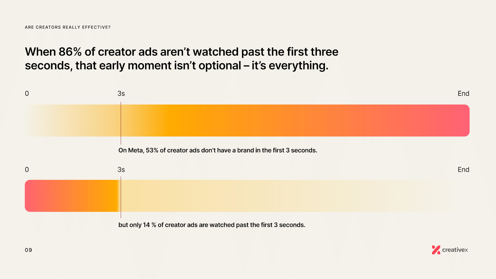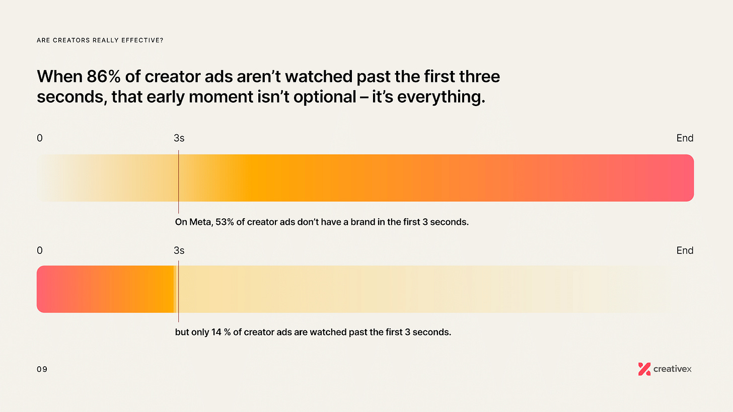 1. Early branding still matters, even for creators - Only 51% of creator ads included brand mentions within the first 3 seconds, and just 14% of users watched beyond that mark. Ads that followed Meta's long-standing âbrand-firstâ rule had a 16% higher video completion rate.