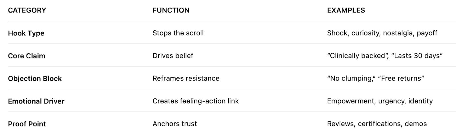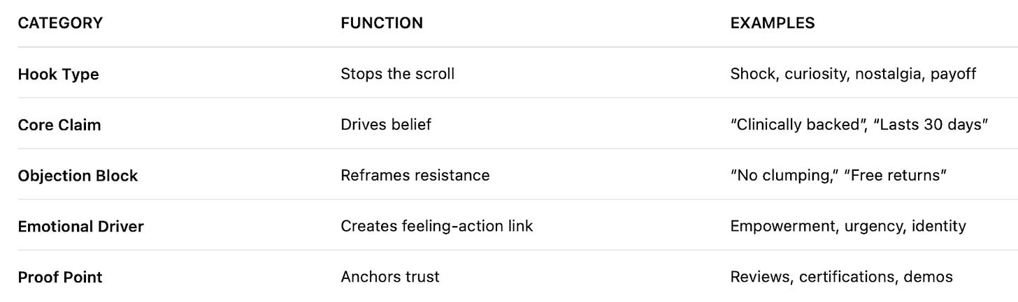 đŹ Ad Messaging Taxonomy: How Elite Teams Classify Hooks, Claims, and Objections