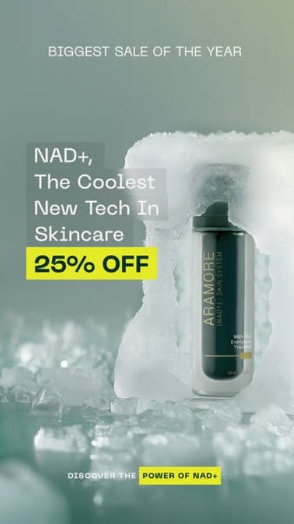 This ad wins because it blends futurism with primal preservation cues, making NAD+ feel both cutting-edge and biologically essential. Every visual and line of copy elevates the product from skincare to breakthrough tech, while the neon discount injects just enough urgency to shift curiosity into action.
