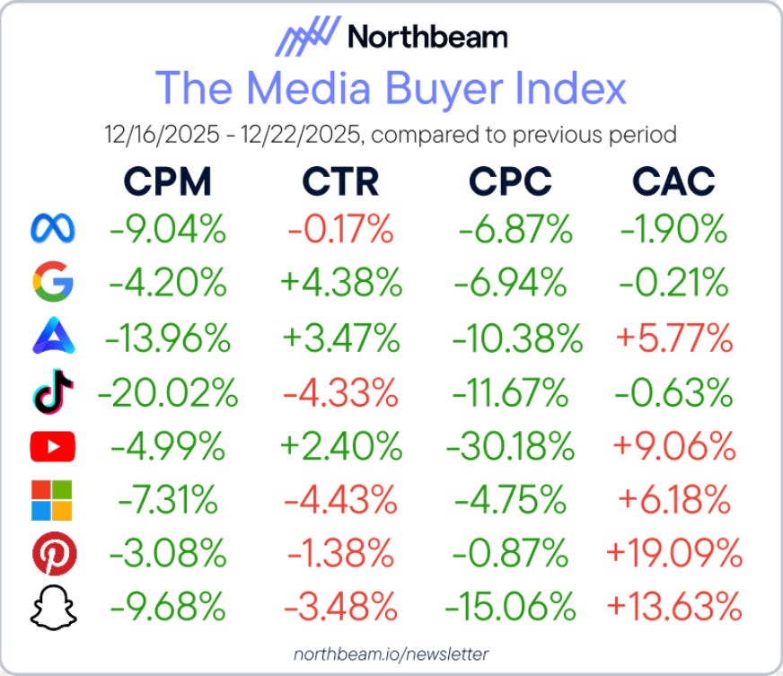 Northbeamâs Media Buyer Index for Dec 16â22 reflects the post-holiday slowdown across paid media. Costs dropped widely, but business outcomes diverged by platform. The data separates cheap traffic from profitable traffic.