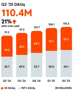 1. User Growth & Geography – Reddit reached 110.4M DAUs (+21% YoY), with U.S. DAUs flat at ~50M and slower international gains (+0.2M QoQ), signaling a possible plateau. Snapchat hit 469M DAUs (+9M QoQ), almost all from Rest of World markets like India, while losing users in North America and seeing EU stagnation.