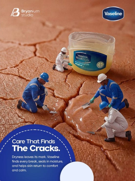 This ad translates skincare into a physical repair metaphor your brain instantly understands. Cracked skin becomes literal broken ground, and Vaseline becomes the material that fixes it. No interpretation needed, the problem and solution click visually.