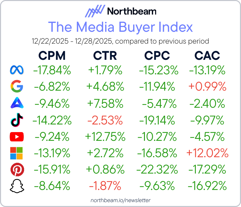 Northbeamâs Media Buyer Index for Dec 22â28 shows the typical post-holiday reset. Costs dropped across almost every major platform. The real signal is which platforms turned cheaper traffic into real gains.