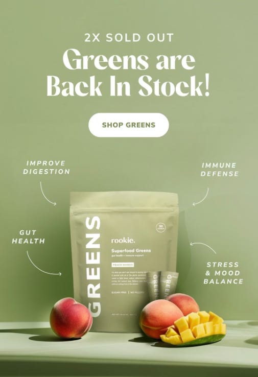 This ad sells relief from missing out, not greens. “2x sold out” + “back in stock” creates a loop where demand already happened, and now you’re catching up. It positions the product as something people regret missing, not something they’re discovering.