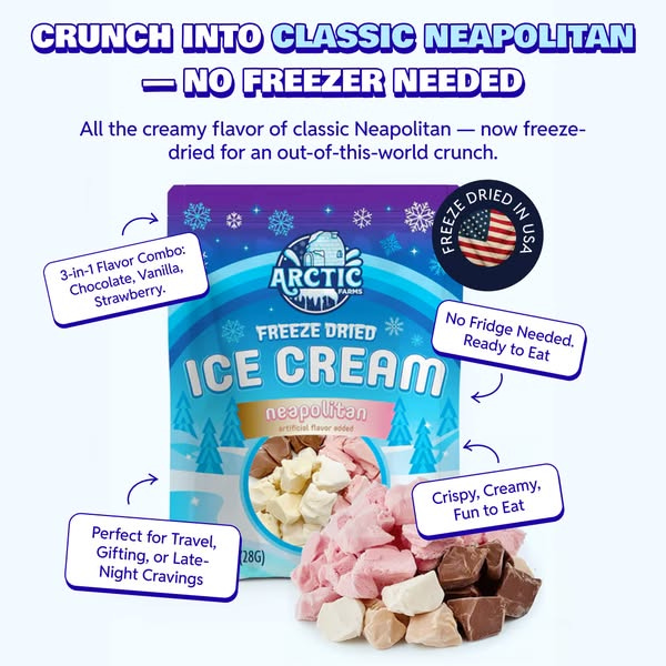 1. Headline built on contrast - The line “Crunch into classic Neapolitan, no freezer needed” works because it hooks with something familiar (ice cream) and flips the expectation (no freezer). A smart move here is to keep playing with contrasts—comfort vs. convenience, classic vs. new, to make the value instantly clear.