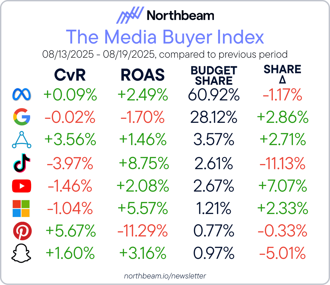 Meta still commands 60.9% of ad budgets, followed by Google at 28.1%, meaning small gains there impact the most dollars. But TikTok, with just a 2.6% share, posted the biggest ROAS lift, showing that underweight platforms can punch above their spend. For performance marketers, aligning budget with shifting cost-to-return ratios could unlock outsized efficiency this quarter.