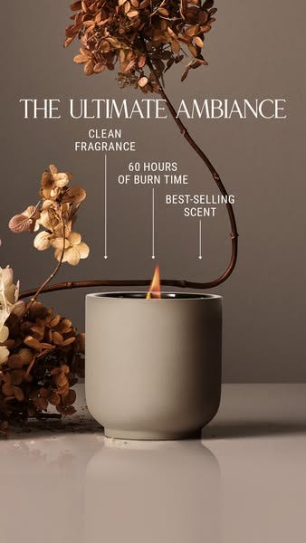 3. Micro-Sell Through Precision Labeling - Rather than a cluttered feature list, the ad uses three measured callouts (“Clean Fragrance,” “60 Hours of Burn Time,” “Best-Selling Scent”). In wellness or slow-luxury brands, your copy rhythm must mirror your product’s emotional promise. Write like your brand breathes.