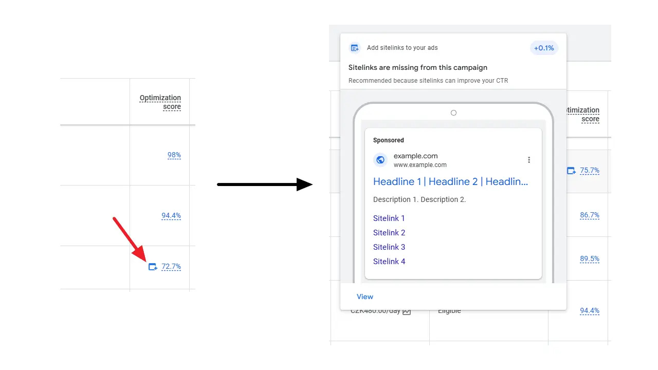 1. Inline Tips Now Appear Beside Optimization Scores - A new hover icon next to the Optimization Score quietly surfaces one-click insights like “add sitelinks” or “fix disapproved ads,” removing the need to enter the Recommendations tab.