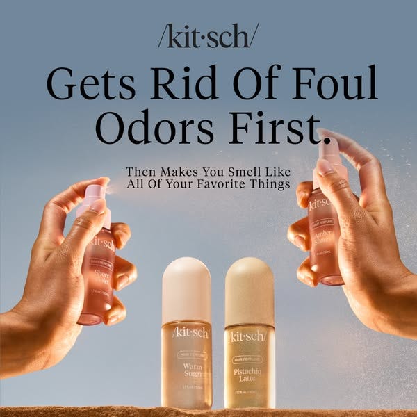 Kitsch reframes a crowded fragrance space by tackling odor first (problem-aware), then linking scent to joy (emotion-aware). Its copy is structurally sound—problem → transformation—and visually reinforced with tangible, warm, human imagery.