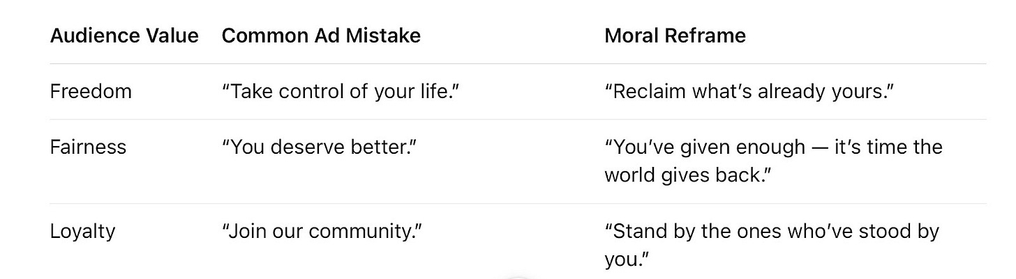 People donât act because you tell them to. They act when your message speaks the moral language they already live by. Hereâs how moral reframing looks in practice: