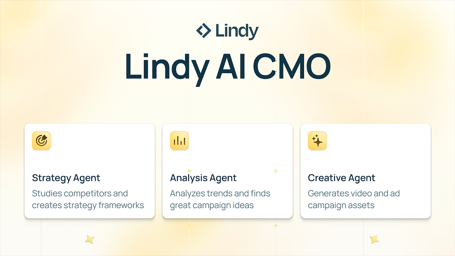 Lindy AI CMO agents analyze competitors, write strategy docs, create campaign briefs, and generate assets, all organized in Airtable. Your 24/7 marketing team that ships campaigns fast.