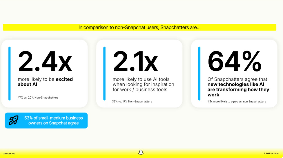 The report says the platformâs creator-driven and casual format opens space for brand storytelling. Snapchat users are 1.7Ă more receptive to B2B storytelling content, particularly creator-led business insights and entrepreneurial journeys.