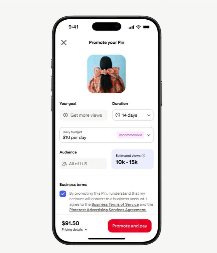 Promote a Pin gives creators and small businesses a simple way to amplify top-performing organic Pins. A few taps, set a budget, and Pinterestâs Taste Graph handles targeting across its 619 million high-intent users.