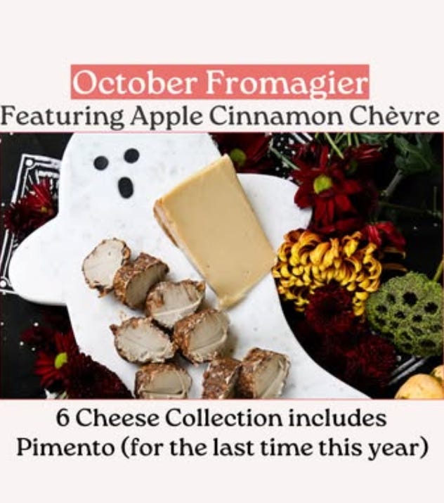 1. Scroll-Stopping Visual Hierarchy: Seasonal Contrast as a Hook - The white ghost-shaped cheese board against deep florals instantly stops the eye; it’s visually eerie yet elegant. The product doesn’t compete for space; its environment elevates it. The red headline (“October Fromagier”) commands immediate attention through color contrast.