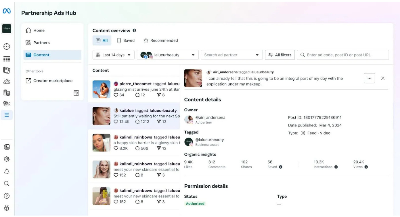 1. Centralized creator discovery - Meta’s Partnership Ads Hub now unifies Instagram and Facebook creator posts, tagging your brand, letting advertisers review opportunities and performance metrics like views and saves in one place to speed up partnership evaluation.