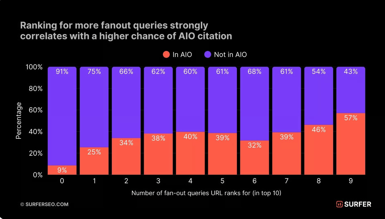 Pages ranking for both the primary query and at least one fan-out made up 51.2% of AIO citations. Pages ranking only for the main query accounted for just 19.6%. Dual coverage made pages 161% more likely to be cited.