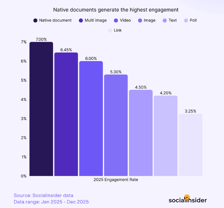 PDFs Beat Video - Native document posts drive more engagement than image or video on LinkedIn, though a lower volume of document posts in the sample could skew results, but original research and insights consistently perform especially well in this format.