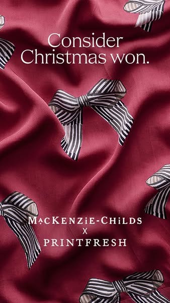 3) Brand collaboration as status reinforcement - By placing âMacKenzie-Childs x Printfreshâ below in symmetrical alignment, the ad leverages the âmutual halo effect.â The collaboration itself becomes the object of desire, prestige multiplied by partnership. This primes exclusivity without stating it.