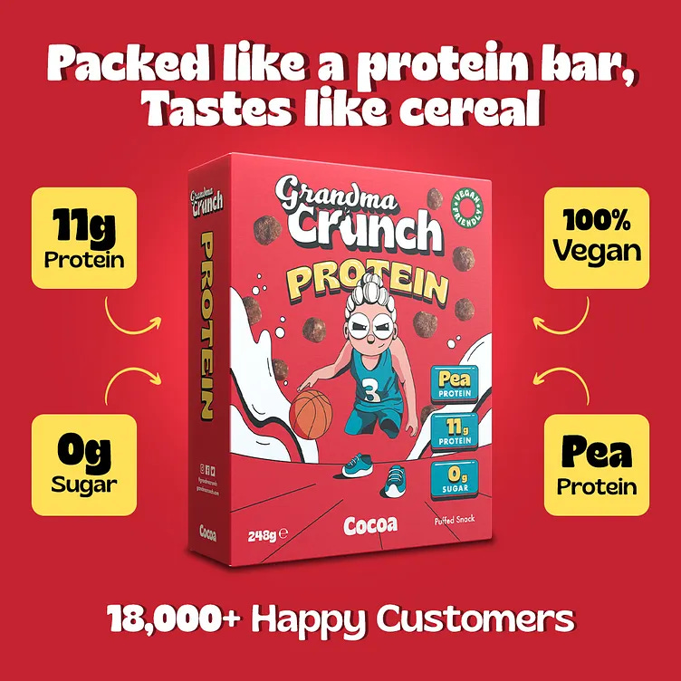 2 Fun, playful packaging design - The stat callouts,11g protein, 0g sugar, 100% vegan, sit exactly where the eye lands after reading the headline, locking in trust before the mind has time to wander. Changing the order of these benefits based on audience priority can push conversion higher, whether that’s leading with “0g sugar” for weight-watchers or “11g protein” for performance-focused buyers.
