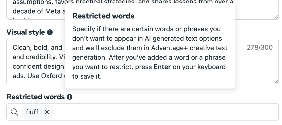 1. Metaās Restricted Words ā Advertisers can now block certain words or phrases from appearing in AI-generated ad text. This joins existing branding controls like logos, colors, fonts, and tone, helping brands avoid generic or off-brand AI phrasing.