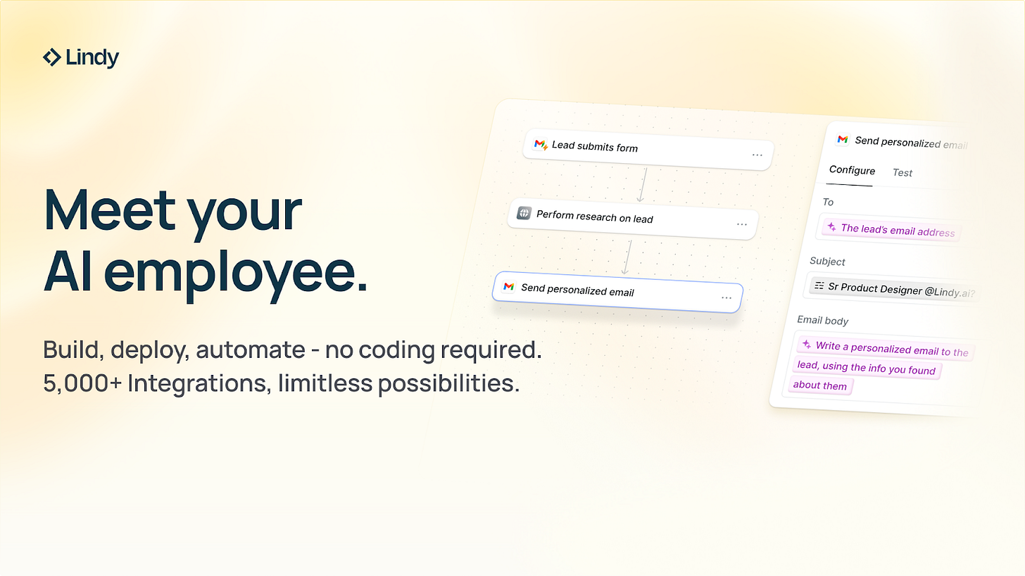Thatâs Lindy, your 24/7 AI employee that builds, runs, and delivers without a single line of code. Just describe what you need, and Lindy handles the rest, from automating leads to managing weekly reports while you focus on growth.