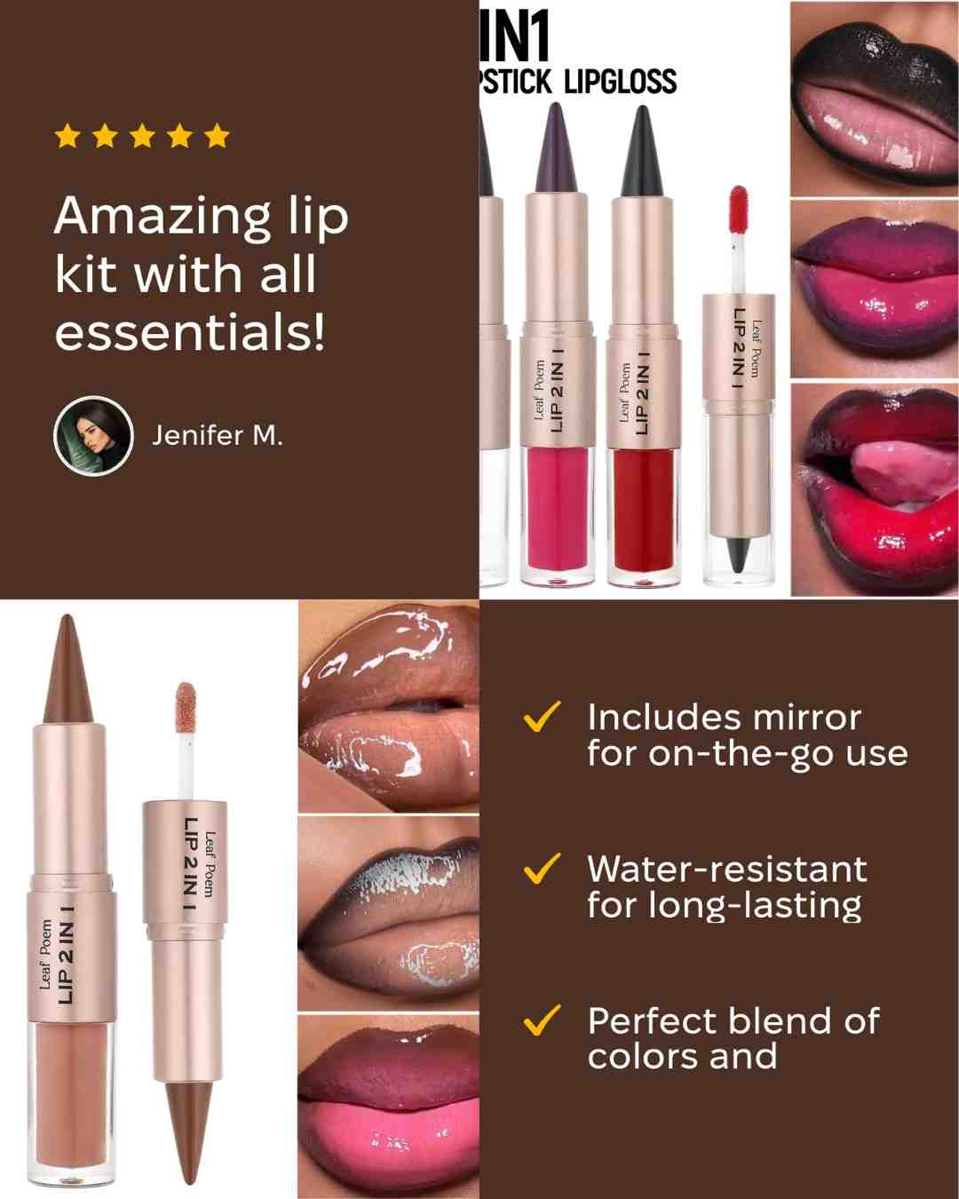 2. Everything is shown, nothing hidden - Product shots, real lips, feature callouts, and a human review all stack quickly so the buyer doesnât need to imagine results.