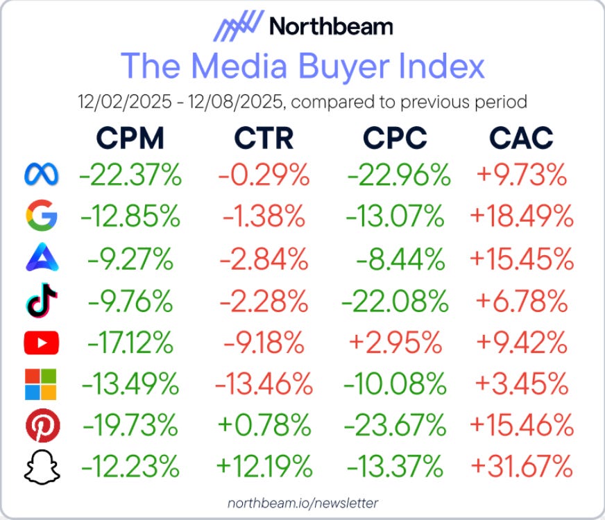 1. CPC - CPCs dropped almost everywhere, with Meta, TikTok, and Pinterest leading the fall, which signals cheaper reach but also hints that algorithms are prioritising low-intent users who look efficient on paper but rarely convert.