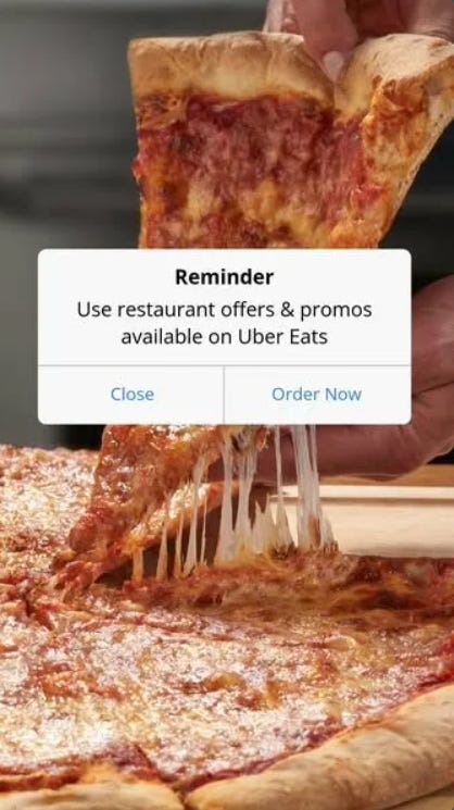 They Hacked Your Brain’s UI - That’s not an ad. It’s a fake push notification sitting on top of food porn. Your thumb is already moving to dismiss or tap before your brain registers it’s paid media. Pattern interruption via interface mimicry, and it works because it meets you inside a mental model you already have