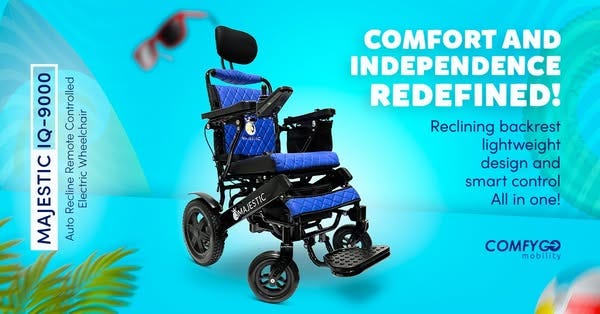 The electric wheelchair is the focal point, shown in dynamic tilt to subtly highlight its recline feature. Its padded design and sharp colors make it feel less clinical and more personal, almost luxury-inspired.