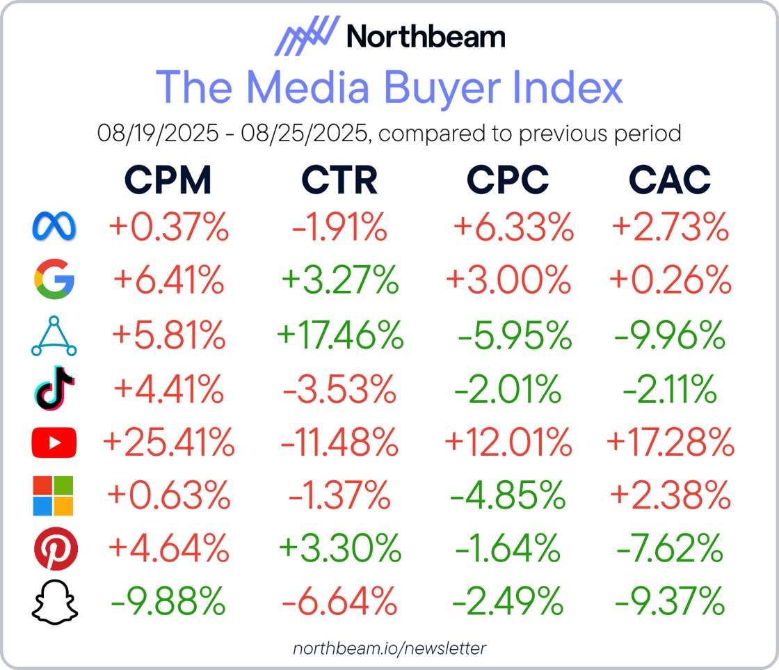 1. CPCs Rising on Big Players - YouTube (+12%), Meta (+6.3%), and Google (+3%) saw higher CPCs, making large-scale campaigns more expensive. In contrast, App Ads (-5.9%), Microsoft (-4.9%), and Snapchat (-2.5%) stayed cheaper, offering room to test and expand before costs rise further.