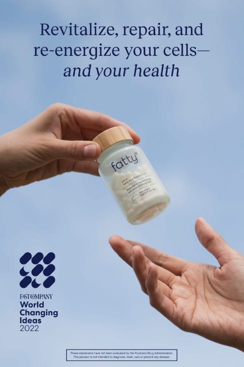 This ad elevates the product from a supplement to a biological upgrade narrative. “Revitalize, repair, re-energize your cells” zooms the benefit down to a cellular level, making the impact feel deeper, more fundamental, almost invisible but powerful.