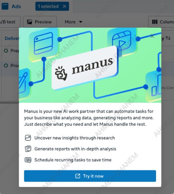Meta has rolled Manus AI into Ads Manager through the Tools section, with some advertisers now seeing in-stream prompts, helping with reporting, audience research, and handling repetitive campaign tasks more efficiently within one workflow.