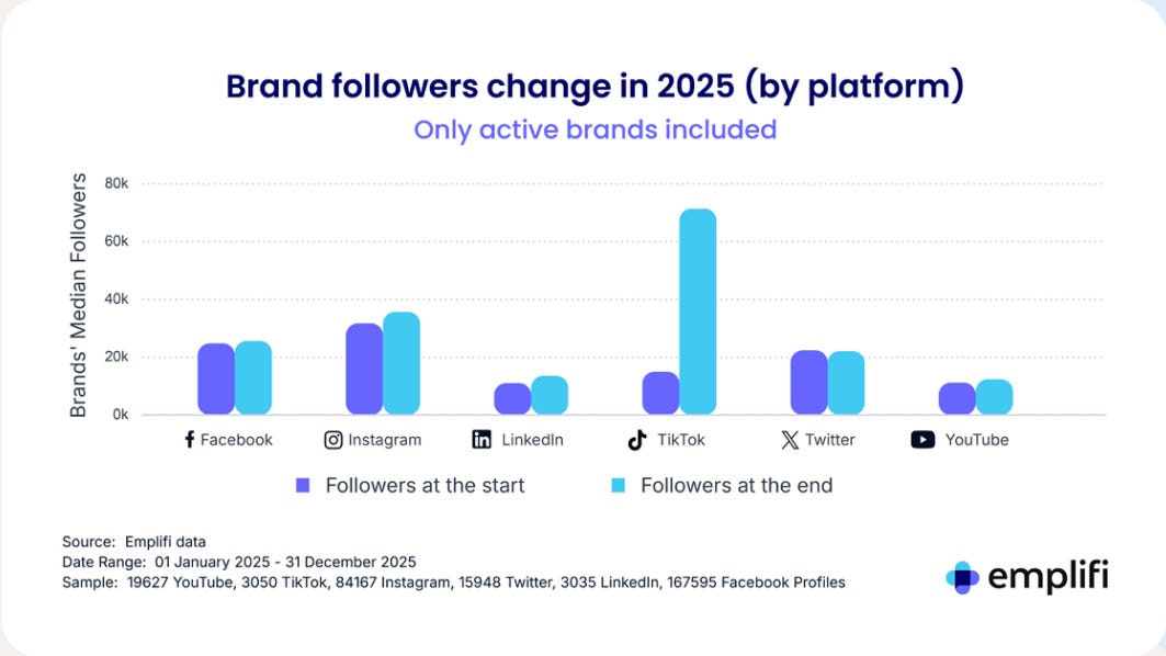 1. TikTok Is the Growth Engine - Brands saw over 200% median follower growth on TikTok last year, with strong engagement when content feels native and entertaining, not overly polished or traditional brand advertising.