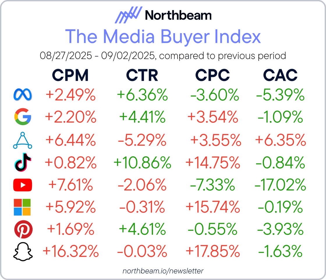 AI-driven ad performance data from Northbeam (Aug 27 â Sep 2, 2025) shows sharp divergences across platforms in cost and efficiency. While Meta and Google continue to command budget share, smaller platforms reveal hidden opportunities and risks. Hereâs the breakdown.